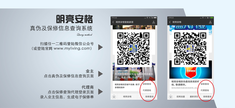 明亮安格公司緊跟時代發展,建立電子保修服務系統,全國連網數據庫支持,正品保證,手機上即時錄入與查詢,讓安裝信息一目了然,可以為客戶提供更優質服務的同時,使客戶更有歸屬感,信任感。